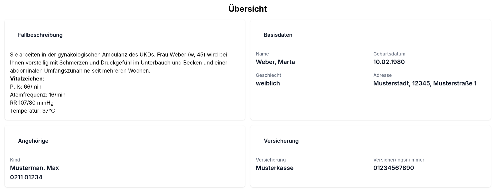 "vignette_patient": "Sie sind Frau $name_last, $age Jahre alt und haben Schmerzen und ein Druckgefühl im Unterbauch. Ihr Bauchumfang hat seit mehreren Wochen zugenommen. "